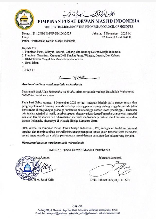 KABARINDO, JAKARTA – Pimpinan Pusat Dewan Masjid Indonesia (PP DMI) menyampaikan kecaman keras atas tindakan pengeroyokan terhadap seorang mahasiswa bernama Arjuna Tamaraya (21) hingga tewas di Masjid Agung Sibolga, Sumatera Utara, pada 1 November 2025. Aksi brutal itu dilakukan oleh lima orang pemuda di area rumah ibadah yang seharusnya menjadi tempat suci dan aman bagi umat.