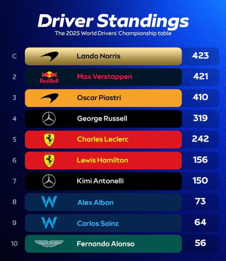 Setelah start dari posisi kedua, Norris merosot ke posisi ketiga setelah disalip Piastri. Saat Verstappen memimpin sebagian besar balapan, pilot Inggris harus berjuang keras melawan Charles Leclerc dari Ferrari di urutan keempat untuk mempertahankan posisi terdepan di klasemen.