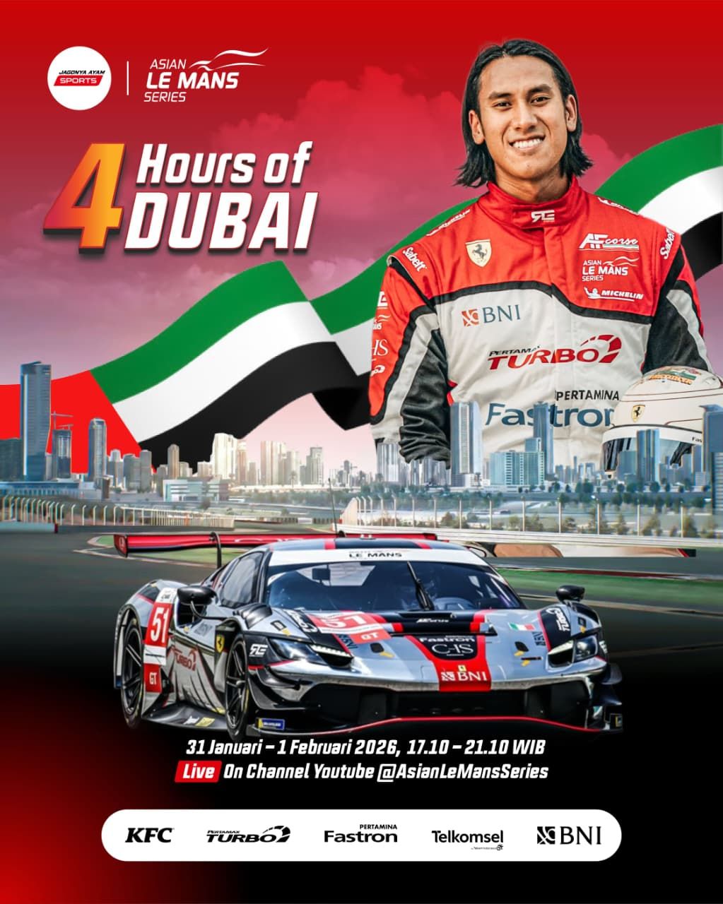 Race 3 ALMS 4 Hours of Dubai disiarkan langsung oleh kanal youtube @AsianLeMansSeries pada hari Sabtu (31/1), di mana start pada pukul 17.10 WIB. Sean Gelael berpartisipasi pada ALMS berkat dukungan dari KFC Indonesia, Pertamax Turbo, Pertamina Fastron, Telkomsel, dan BNI.