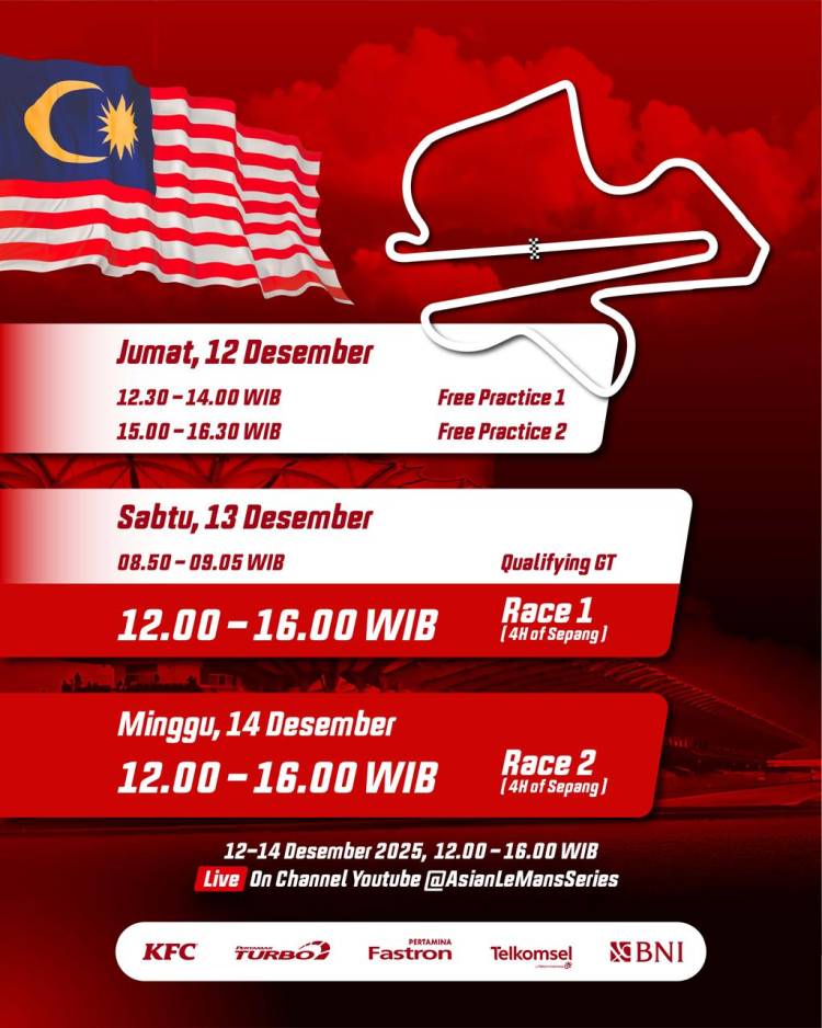 Race 1 dan 2 ALMS 2025/26 di Sepang dapat disaksikan langsung di kanal youtube @AsianLeMansSeries. Race yang masing-masing berdurasi empat jam tersebut akan start pada pukul 12.00 WIB. Sean Gelael tampil di ALMS berkat dukungan dari KFC Indonesia, Pertamax Turbo, Pertamina Fastron, dan BNI.